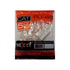 Conector RJ45 Nexxt  Categoria 5e  100 Piezas por Paquete, contactos bañados con oro de 30μ Fabricados con material termoplástico de alto impacto pueden ser utilizados para aplicaciones de redes, de redes categoría 5E o categoría 6. Se pueden utilizar con cables sólidos o multifilar. Cuenta con 8 contactos de bronce fosforoso, bañados con oro y níquel. Disponible en bolsas de 100 unidades.